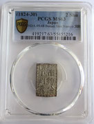 初期書体の文政南鐐二朱銀で、面背とも比較的玉が入っていますので、丁寧に作られた感じが残っています。地肌・文字ともほぼ摩耗のない未使用に近い状態です。私見ですが、PCGSへ送れば、MS62~63位が付くのではないでしょうか。トーンが美しいので、状態以上の質感があります。この機会にいかがでしょうか。