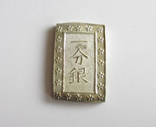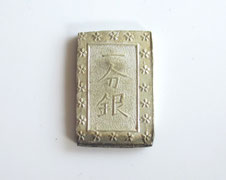 周囲からエッジにかけて、包み出し特有の美しいトーンが付いています。未洗いで状態の良い庄内一分銀・鶴岡製です。背に両替商の刻印が2つあります。最近、ヤフオクでは本物の天保一分銀に、後から"庄"の字を打った偽物の庄内一分銀が頻繁に出品されています。御注意下さい。これは間違いのない真正品です。この機会にいかがでしょうか。